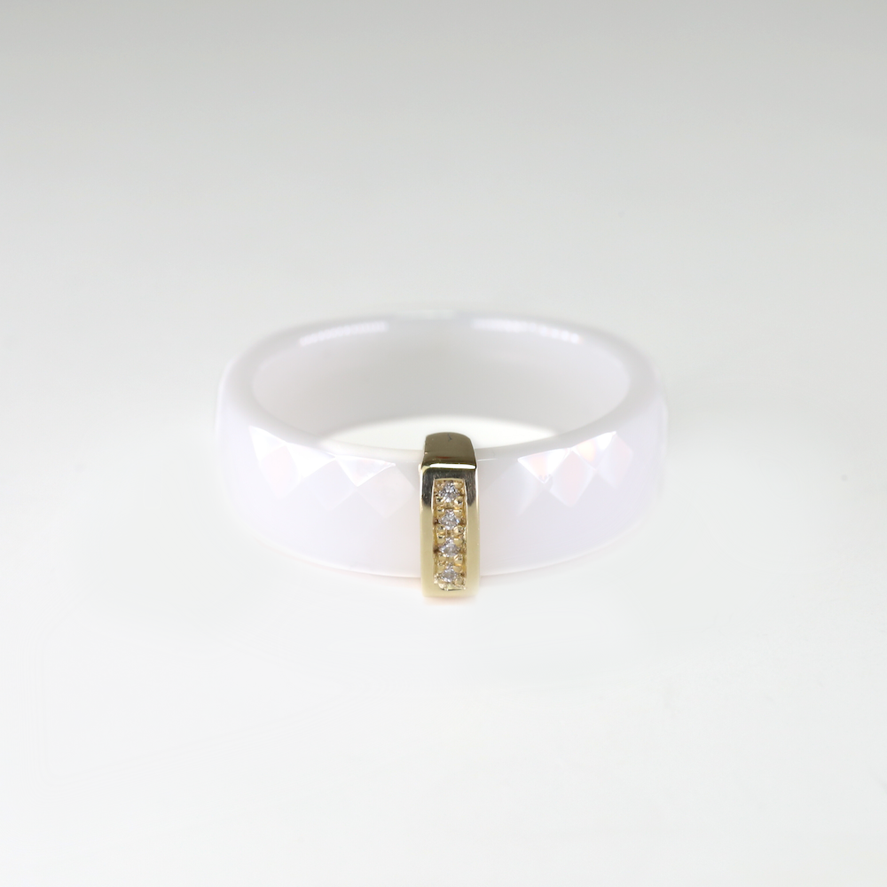 Keramický prsten se 14 Kt žlutým zlatem a přírodními diamanty.