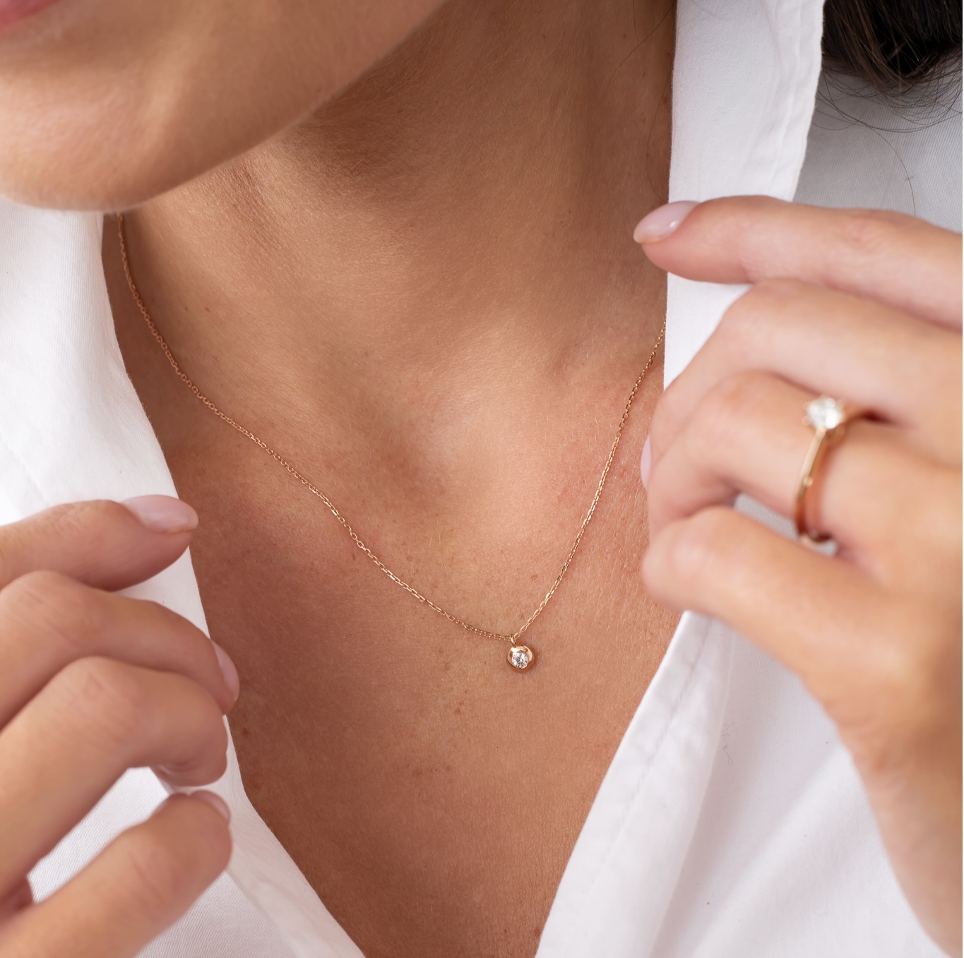 | Náhrdelník ze 14 Kt růžového zlata s přírodním diamantem. Cena šperku je včetně řetízku v délce do 50 cm. Požadovanou délku řetízku v cm napište do poznámky v objednávce. |