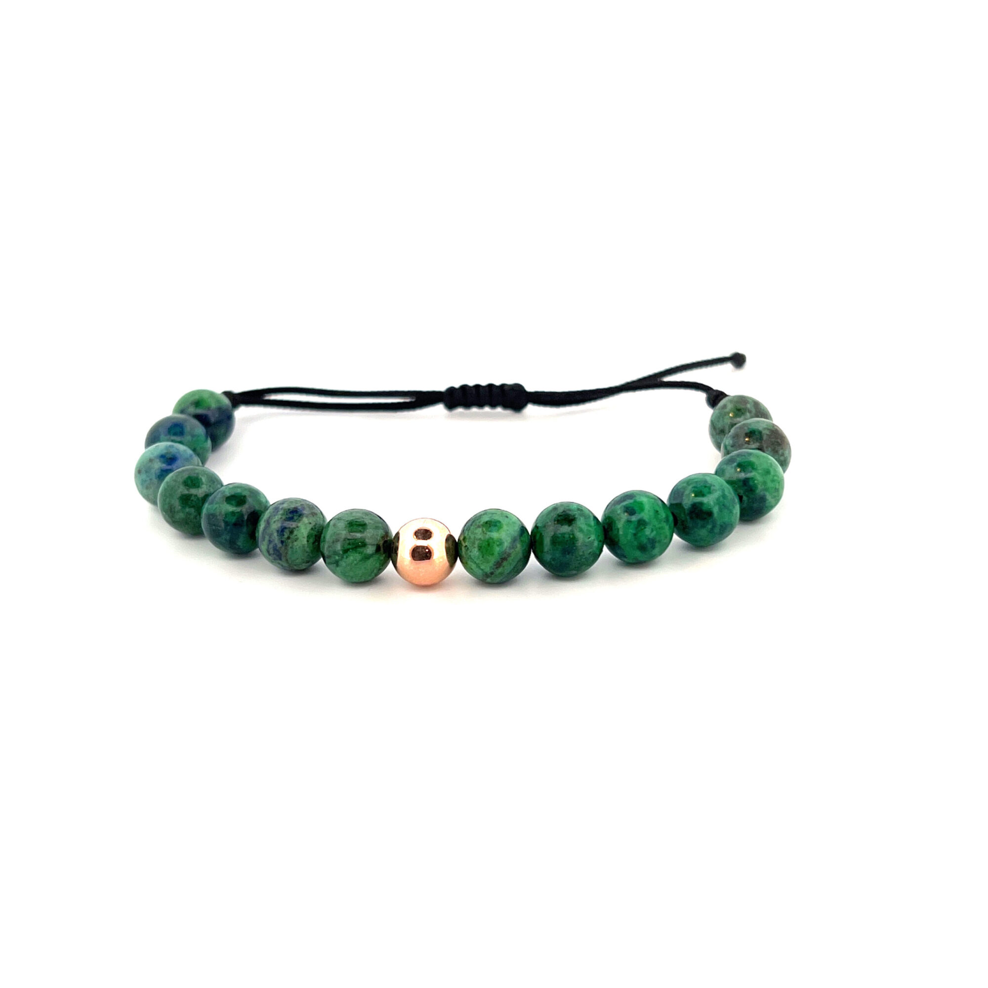 Shamballa náramek zelený Malachit Azurit ve tvaru vrtaných kuliček s 1 středovou kuličkou ze 14 Kt růžového zlata (rozměr 8 mm).