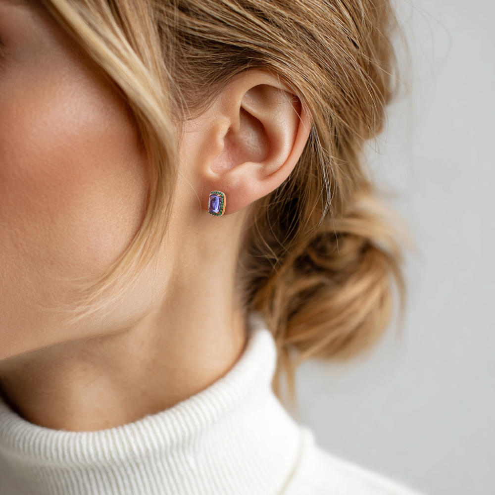 Náušnice ze 14 Kt růžového zlata s tanzanity a smaragdy.