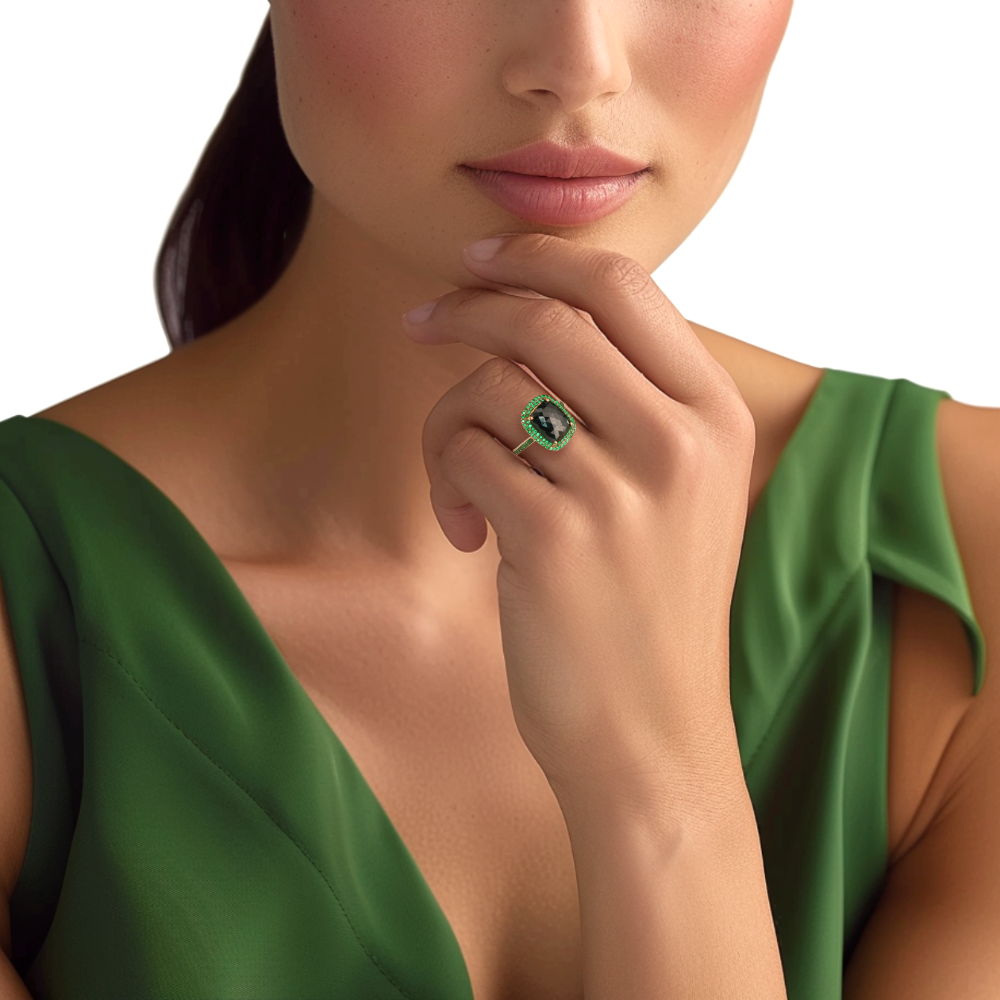 Prsten Black Diamond – růžové zlato, černý diamant, smaragdy