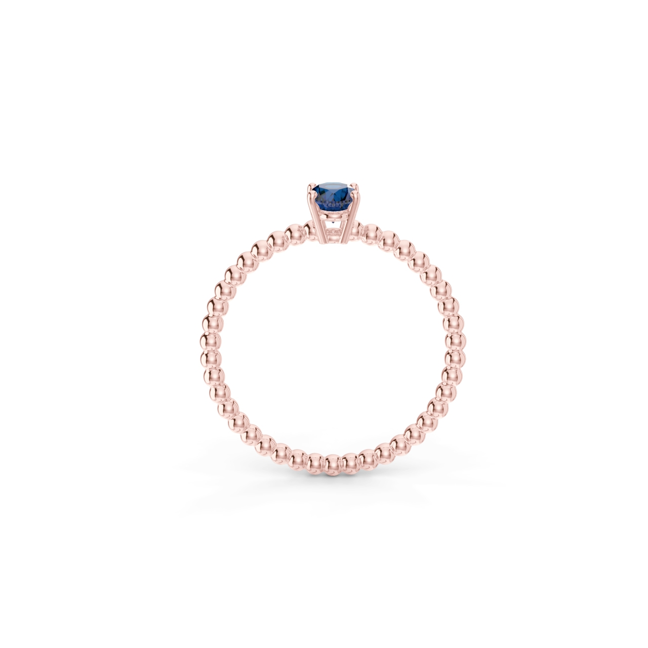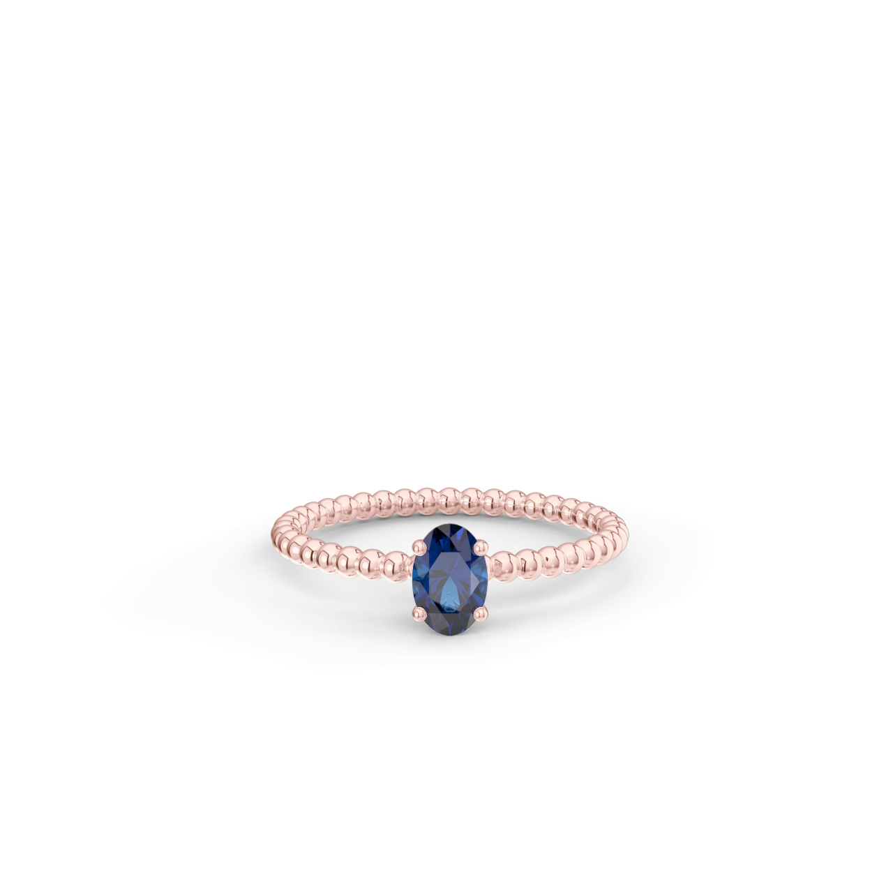 | Prsten z kuličkového 14 Kt růžového zlata s oválným modrým safírem o velikosti 6 x 4 mm. |