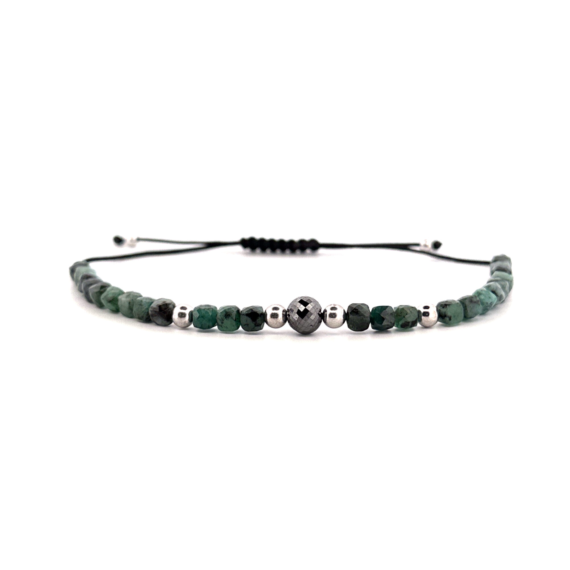 | Náramek Shamballa s vybroušeným černým diamantem ve tvaru kuličky a smaragdy ve tvaru krychle (rozměr přibližně 4 x 4 mm) doplněný o 4 kuličky ze 14 Kt růžového zlata (rozměr 4 mm). |